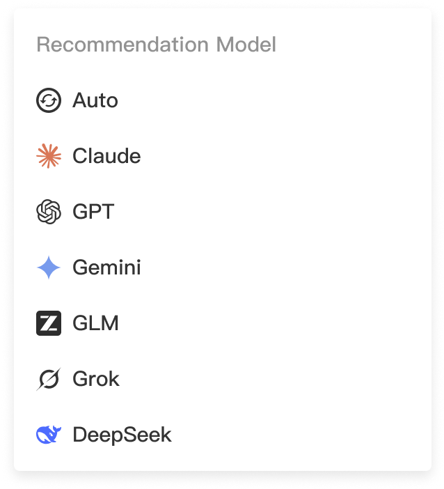 ChatGPT、Claude、Gemini、DeepSeek —— 多款市面主流大模型全覆盖。无需注册多平台、切换账号,一键选择最合适的模型,满足不同场景的智能需求,助你高效完成各类任务。